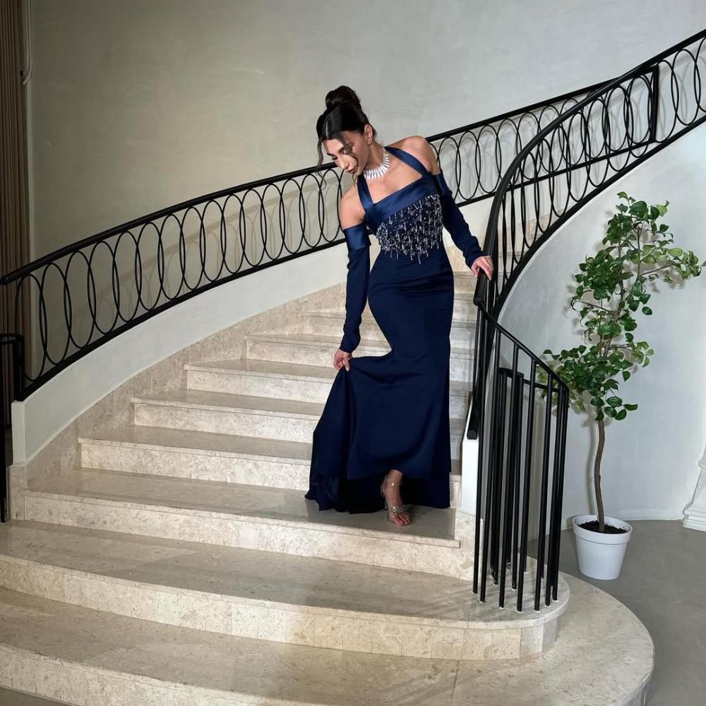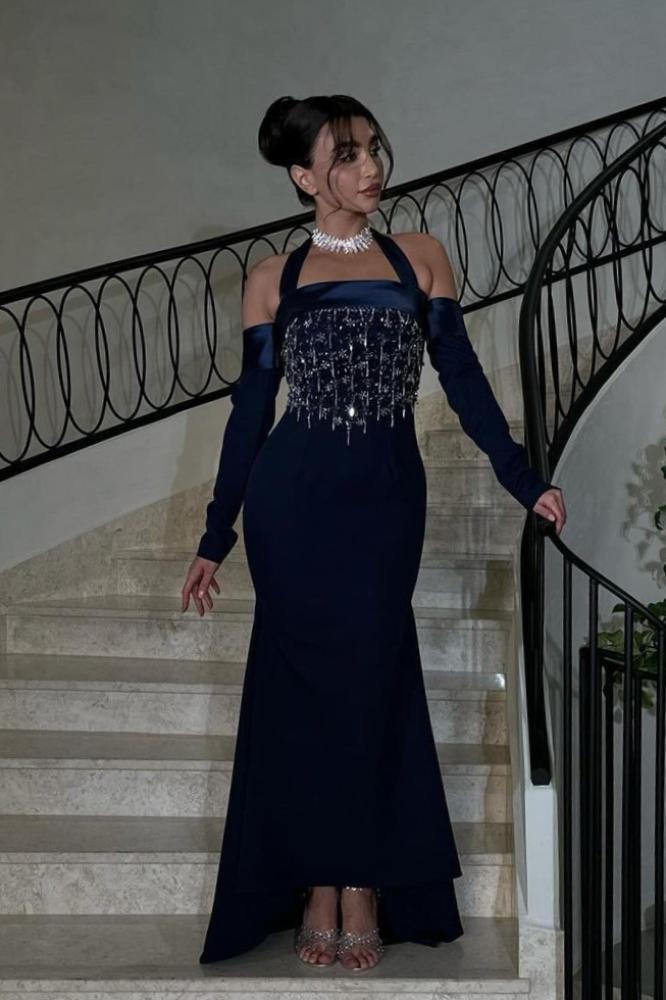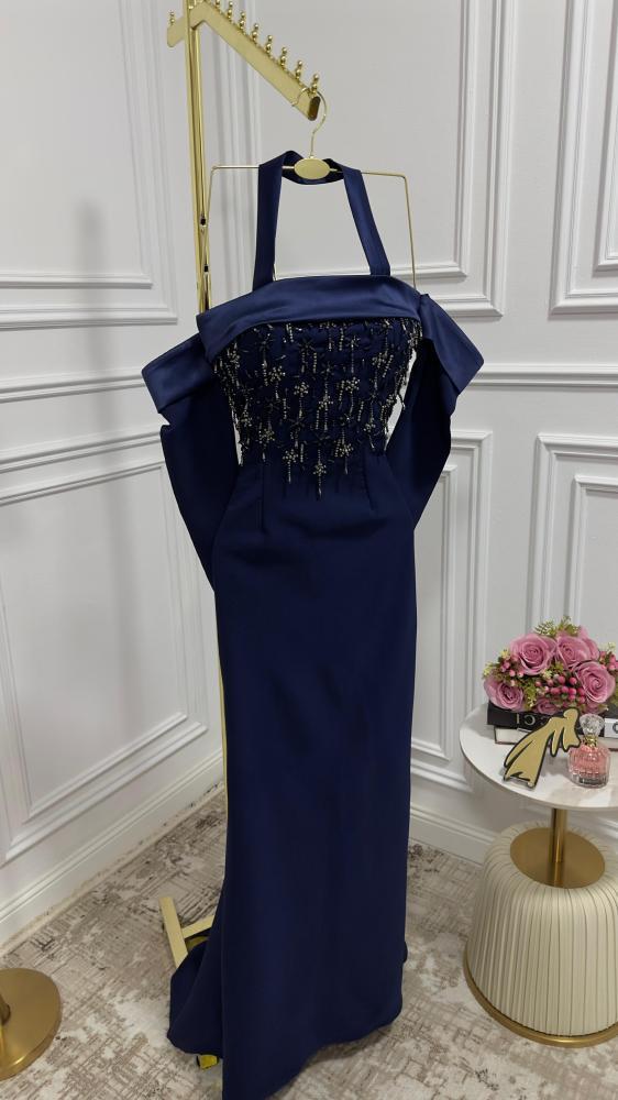 •اللون: الفستان يأتي باللون الكحلي الداكن الذي يضفي لمسة من الرقي والفخامة، ويُعتبر اختيارًا مثاليًا للإطلالات المسائية.
