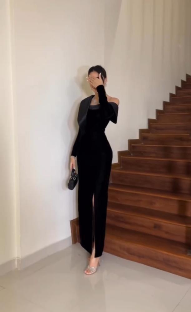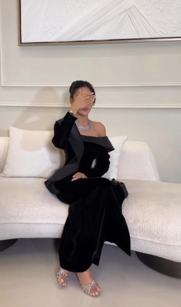 في الصورة، يظهر منتج أنيق يتمثل في فستان سهرة باللون الأسود مصنوع من خامة مخملية راقية. يتميز الفستان بتصميم كتف واحد مكشوف، مع تفاصيل تضفي لمسة عصرية وفاخرة، مثل الثنيات البسيطة عند الصدر وخطوط التصميم الأنيقة.