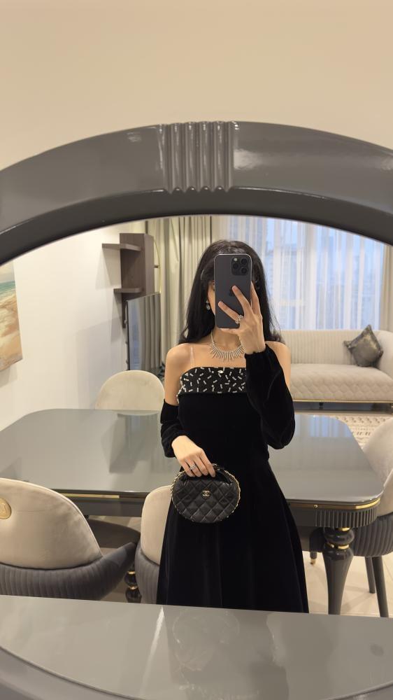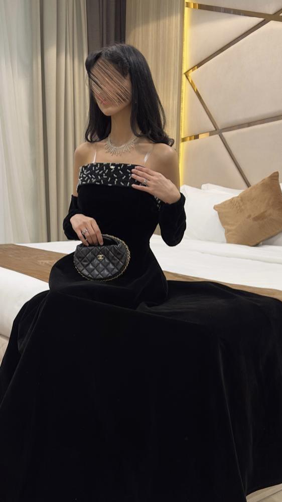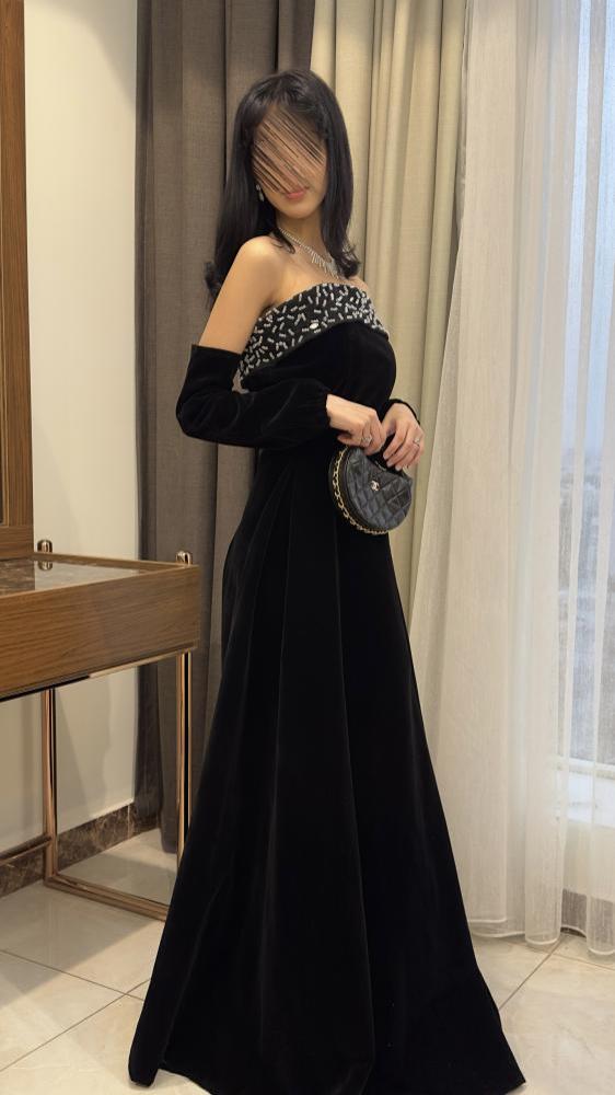 هذا المنتج عبارة عن فستان سهرة مخملي أسود يتميز بالفخامة والرقي. التفاصيل تشمل: